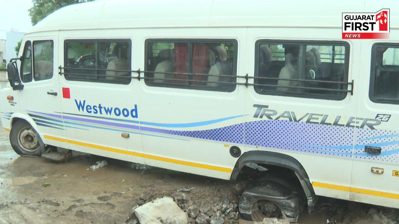 ખાડામાં સ્કૂલ બસ ફસાઈ