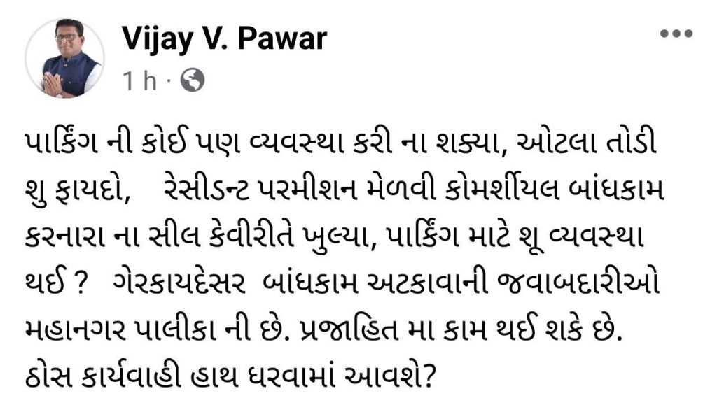 તે બાદ આજે સવારે વિજય વી. પવારની વધુ એક સોશિયલ મીડિયા પોસ્ટ સામે આવવા પામી છે, જેમાં તેઓ જણાવે છે કે, પાર્કિંગની કોઇ પણ વ્યાવસ્થા કરી ન શક્યા, ઓટલા તોડી શું ફાયદો, રેસીડન્ટ પરમીશન મેળવી કોમર્શિયલ બાંધકામ કરનારાના સીલ કેવી રીતે ખુલ્યા, પાર્કિંગ માટે શું વ્યવસ્થા થઇ ? ગેરકાયદેસર બાંધકામ અટકાવવાની જવાબદારીઓ મહાનગર પાલિકાની છે, પ્રજાહિતમાં કામ થઇ શકે છે. ઠોસ કાર્યવાહી હાથ ધરવામાં આવશે ?