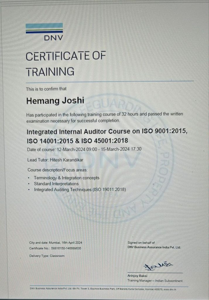 DNV (Det Norske Veritas) એ એક નોર્વે ની સંસ્થા છે, આ સંસ્થા આંતર્રાષ્ટ્રીય સ્તરે તમામ ટોચ ના કાર્યસ્થળો પર વિવિધ સ્ટાન્ડર્ડસ જેવા કે સેફ્ટી, એન્વાયરમેન્ટ, ક્વોલિટી તથા મેનેજમેન્ટ ને લગતા ISO 9001:2015, ISO 14001:2015 તથા ISO 45001:2018. ની વિસ્તૃત તાલીમ મેળવી પરીક્ષા માં સર્વાધીક ગુણાંકથી ઉત્તીર્ણ થઈ પ્રમાણપત્ર મેળવેલ છે.