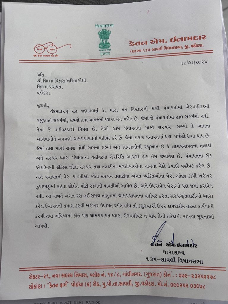 સાવલીના ધારાસભ્ય કેતના ઇનામદાર દ્વારા અવાર-નવાર લોકોના પ્રશ્ને રજુઆત કરવામાં આવતી હોય છે. ત્યારે તાજેતરમાં તેમણે ગ્રામ પંચાયતમાં ચાલતી ગફલેબાજીને લઇને પત્ર લખ્યો હતો. જે હાલ સપાટી પર આવવા પામ્યો છે. જેમાં તેમણે ગંભીર આરોપો લગાવ્યા છે.
