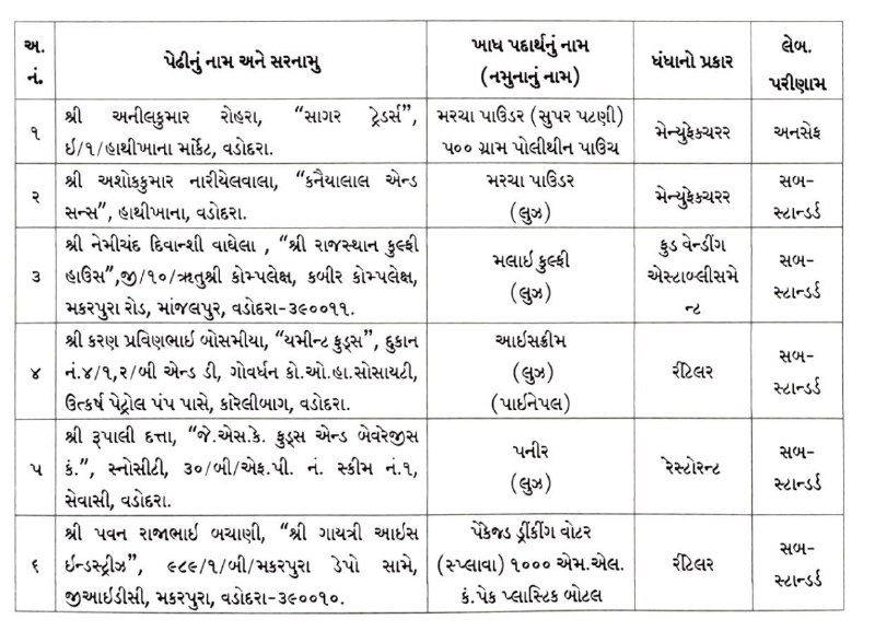 વડોદરા પાલિકાની ખોરાક શાખા દ્વારા લોકોના આરોગ્યને ધ્યાને રાખીને ખાદ્ય પદાર્થોનું ચેકીંગ હાથ ધરવામાં આવતું હોય છે. આ ચેકીંગ દરમિયાન એકત્ર કરવામાં આવેલા નમુનાઓને પાલિકાની ફતંગેજ સ્થિત લેબોરેટરીમાં આપવામાં આવ્યા હતા. જેના પરિણામો સામે આવ્યા છે. તાજેતરમાં પાલિકા દ્વારા શહેરના જુદા જુદા વિસ્તારો હાથીખાના, માંજલપુર, કારેલીબાગ, સેવાસી, મકરપુરા, સુભાનપુરા, વીઆઇપી રોડ, નિઝામપુરા, ગોરવામાં ચેકીંગ હાથ ધરવામાં આવ્યું હતું.