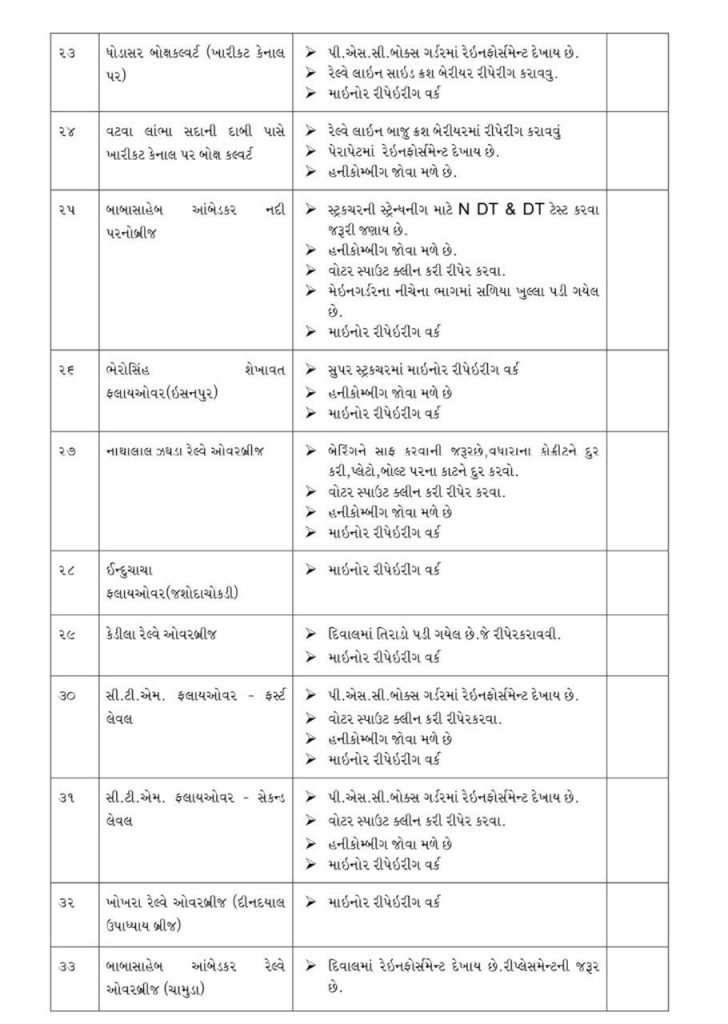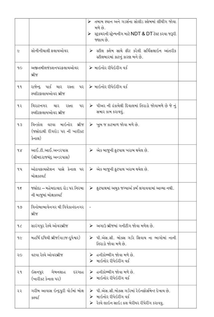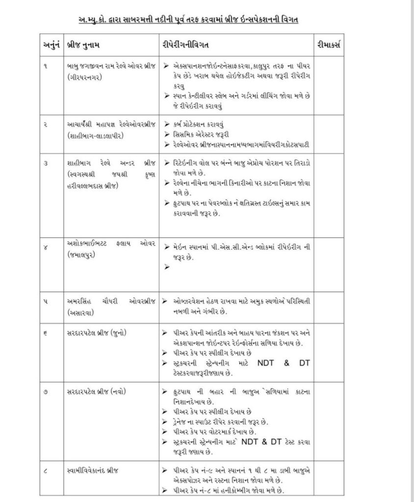 મોરબી દુર્ઘટના બાદ રાજ્ય સરકારે તમામ બ્રિજોના તપાસના આદેશ સ્થાનિક તંત્રને આપ્યા હતા. જે બાદ અમદાવાદ મનપા દ્વારા શહેરના ઐતિહાસિક બ્રિજોના તપાસ માટેના ટેન્ડર આપવામાં આવ્યા હતા. જે પૈકી 69 બ્રિજને હાલ મેન્ટેનન્સની એટલે કે રીપેર કરવાની જરૂર પડી છે. જે પૈકી શહેરના પૂર્વ વિસ્તારના 37 બ્રિજ અને પશ્ચિમ વિસ્તારના 32 બ્રિજ નો સમાવેશ થાય છે. અમદાવાદ શહેરમાં 1892 થી વર્ષ 2024 ના સમયાંતરે બીજો બનાવવામાં આવ્યા હતા. જે પૈકી શહેરમાં 10 બ્રિજ સાબરમતી નદી ઉપર 24 બ્રિજ રેલવે ઓવર બ્રિજ તરીકે 15 રેલવે અંતર પાસ 19 ફ્લાય ઓવર બે ચંદ્રભાગાના નાણા પરના બ્રિજ બે બ્રિજ ખારી નદી પરના તેમ જ છ ખારી કટ કેનાલ પરના બોક્સ કન્વર્ટ નો સમાવેશ થાય છે. જે તમામની તપાસ રોડ એન્ડ બિલ્ડીંગ વિભાગ ની ગાઈડલાઈન મુજબ કરવામાં આવી હતી.