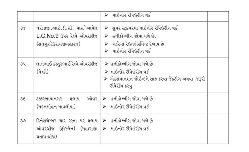 ચોમાસુ પૂર્ણ થયા બાદ આ તમામ બ્રિજ નુ રીપેરીંગ કામ કરવામાં આવશે પ્રથમ તબક્કામાં પૂર્વ વિસ્તારમાં આવેલા બ્રિજનું ટેન્ડર આપવામાં આવ્યું છે જેમાં સેન્ટ્રલવર્જ બીમ કોલમ સ્લેબ બોટલ રેલિંગ સહિતની કામગીરી આગામી સમયમાં કરવામાં આવશે. પ્રથમ તબક્કે પૂર્વના બ્રિજનું રિપેરીગ કરશે બાદમાં પશ્ચિમના બ્રિજનું ટેન્ડર બહાર પાડવામાં આવશે પૂર્ણ બ્રિજ માટે ૨ કરોડથી વધુની રકમ હાલ એએમસી દ્વારા મંજૂર કરવામાં આવી છે.