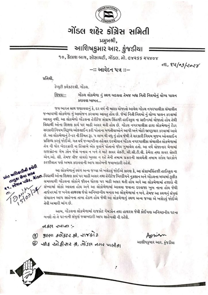 GONDAL : કોંગ્રેસ સમિતિ દ્વારા લોકમેળાનું સ્થળ બદલવા રજુઆત