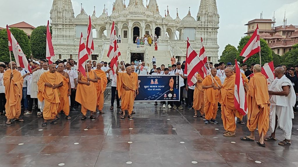 GONDAL : શ્રી અક્ષર મંદિરના 10 સંતો સહિત 700 હરિભક્તોની પદયાત્રા યોજાઈ