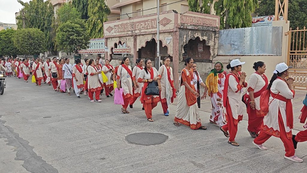 GONDAL : બીએપીએસ ના વડા મહંત સ્વામી મહારાજ રાજકોટ બિરાજતા હોય ગોંડલના ૭૦૦ હરિભક્તોએ પદયાત્રા દ્વારા મહંત સ્વામી મહારાજના ચરણોમાં ભક્તિ અધ્ર્ય અર્પણ કર્યું. ગોંડલના શ્રી અક્ષર મંદિર દ્વારા એક વિશિષ્ટ પદયાત્રાનું આયોજન કરવામાં આવ્યું હતું. જેમાં કુલ ૭૦૦ હરિભક્તો જોડાયા હતા.