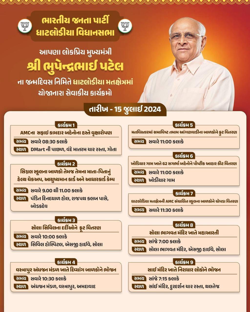 ત્યાર બાદ મુખ્યમંત્રી ભૂપેન્દ્ર પટેલ 9 થી 9.30 કલાક દરમિયાન બોડકદેવ (Bodakdev) ખાતે સિગ્નલ સ્કૂલના બાળકો તેમ જ તેમના માતા-પિતાનું હેલ્થ ચેકઅપ, આયુષ્યમાન કાર્ડ અને આધારકાર્ડ કેમ્પમાં ભાગ લેશે. સવારે 10 કલાકે સોલા સિવિલ હોસ્પિટલના દર્દીઓને ફ્રૂટ વિતરણ કરશે. ત્યાર બાદ સવારે 10.30 કલાકે વસ્ત્રાપુર અંધજન મંડળ (Vastrapur Andhajan Mandal) ખાતે દિવ્યાંગ બાળકોને ભોજન પીરસશે. મુખ્યમંત્રી ભૂપેન્દ્ર પટેલ (CM Bhupendra Patel) સવારે 11 કલાકે મતવિસ્તારમાં આંગણવાડીના બાળકોને ફ્રૂટ વિતરણ, ત્યાર બાદ ખોડિયાર ગામે સગર્ભા બહેનોને પૌષ્ટિક આહાર કીટનું વિતરણ, ઘાટલોડિયામાં (Ghatlodia) AMC સંચાલિત સ્કૂલનાં બાળકોને ચોપડા વિતરણ કરશે. ત્યાર બાદ સાંજે 7 કલાકે સોલા ભાગવત મંદિરમાં (Sola Bhagwat Temple) મહાઆરતી કરશે. ઉપરાંત, થલતેજનાં (Thaltej) સાંઇ મંદિર ખાતે નિરાધાર લોકોને ભોજન પીરસશે.