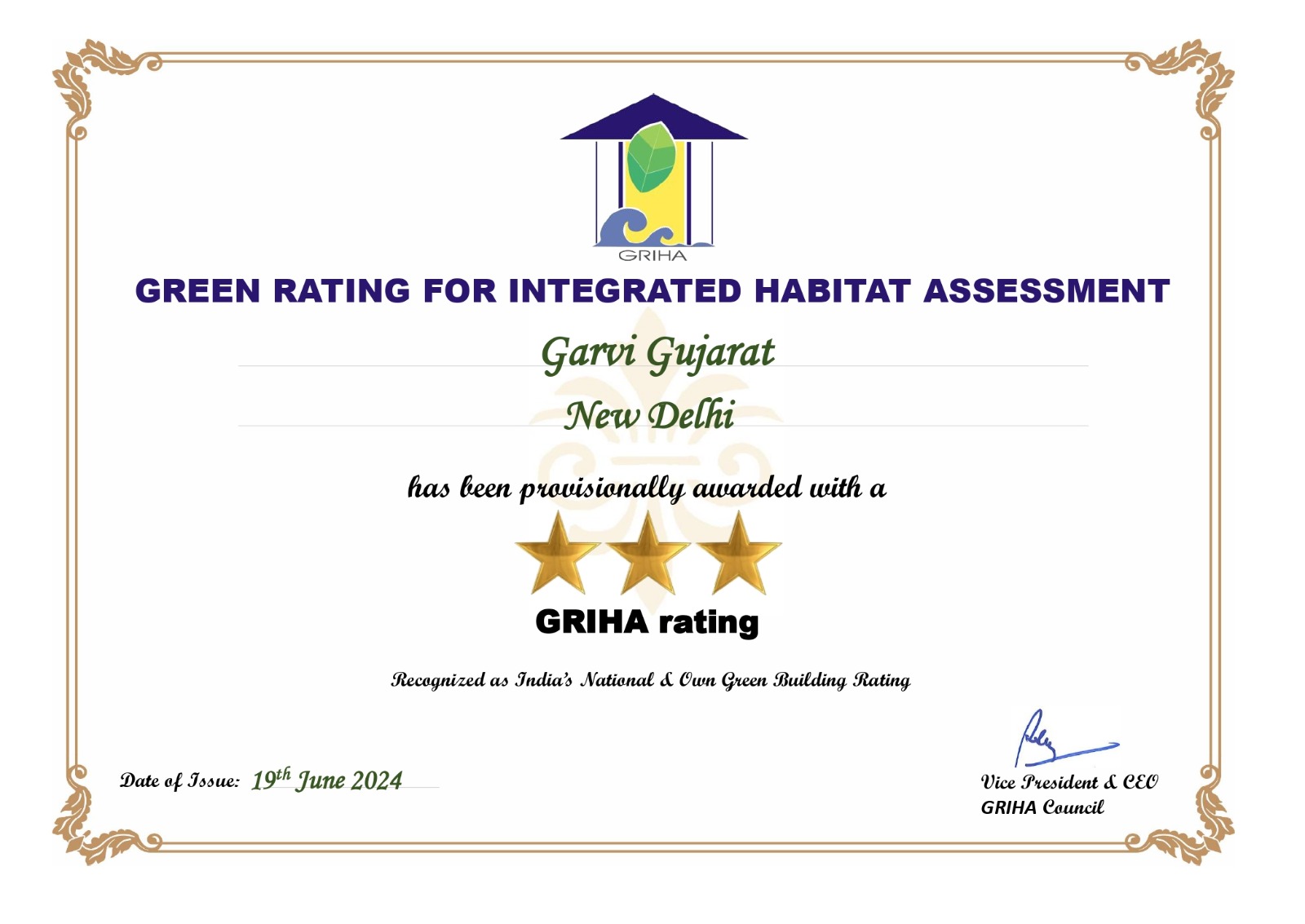 જણાવી દઈએ કે, GRIHA એટલે કે રહેણાંકનાં માધ્યમથી ઉત્સર્જનની તીવ્રતામાં ઘટાડાનું મૂલ્યાંકન કરવા માટેનું એક મહત્ત્વપૂર્ણ સાધન છે, જે રાષ્ટ્રનાં ‘રાષ્ટ્રીય રીતે નિર્ધારિત યોગદાન’ (Nationally Determined Contributions) માં દર્શાવ્યા મુજબ ક્લાઇમેટ ચેન્જની સમસ્યાનો સામનો કરવા માટે ભારતની મિટિગેશન સ્ટ્રેટેજી એટલે કે શમન વ્યૂહરચનામાં મહત્ત્વપૂર્ણ ભૂમિકા ભજવે છે. TERI અને ભારત સરકારના નવા અને પુનઃપ્રાપ્ય ઊર્જા મંત્રાલય દ્વારા વિકસિત કરવામાં આવેલી GRIHA રેટિંગ સિસ્ટમને વર્ષ 2007 માં ભારત સરકાર દ્વારા ગ્રીન બિલ્ડિંગો માટેનાં રાષ્ટ્રીય ધારાધોરણ તરીકે અપનાવવામાં આવી હતી. ઉલ્લેખનીય છે કે, ગરવી ગુજરાત બિલ્ડિંગનું ઉદ્ઘાટન વડાપ્રધાન નરેન્દ્ર મોદી (PM Narendra Modi) દ્વારા સપ્ટેમ્બર 2019 માં કરવામાં આવ્યું હતું.
