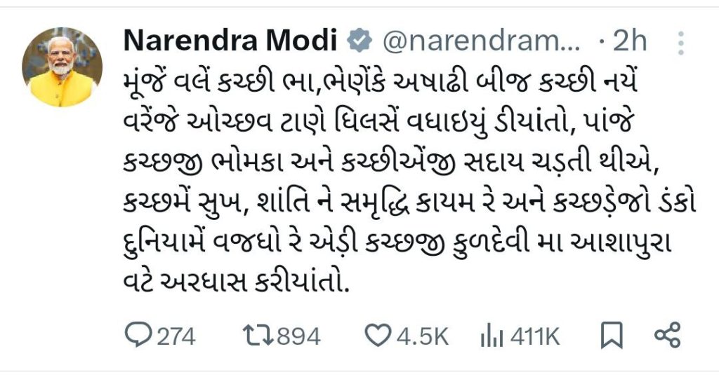 કચ્છી નવા વર્ષ અષાઢી બીજની શુભેચ્છા વડાપ્રધાન નરેન્દ્રભાઈ મોદીએ પાઠવી હતી.વડાપ્રધાન નરેન્દ્રભાઈ મોદીએ સર્વે ક્ચ્છવાસીઓને ટ્વીટર પર શુભકામના પાઠવી હતી. મા આશાપુરાના સર્વે પર આશીર્વાદ રહે અને કચ્છની ભૂમિ સદાયે વિકસતી રહે તે માટેની શુભકામના પાઠવી હતી.વડાપ્રધાન નરેન્દ્રભાઈ મોદીએ કચ્છી શૈલીમાં શુભકામના પાઠવી હતી. કચ્છમાં સુખ શાંતિ અને સમૃદ્ધિ કાયમ જળવાઈ રહે તે માટે રાજ્યના મુખ્યમંત્રી ભુપેન્દ્રભાઈ પટેલે પણ અષાઢી બીજની ટ્વીટર પર શુભકામના પાઠવી હતી