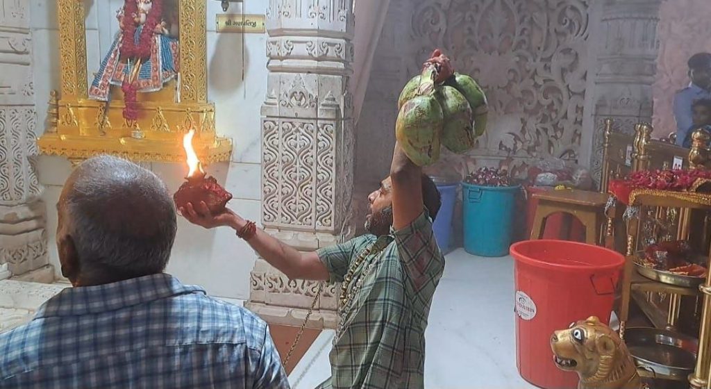 માતાજીના દર્શન દડવંત કરી કરવાની નેમ સાથે 23 વર્ષથી આવતાં માઇ ભક્ત અલ્પેશભાઈ સાથે માતાજીના અભિષેક માટે લીલા નારિયેળના પાણીનો અનેરો મહિમા હોવાની આસ્થા ધરાવે છે. જેથી તેઓ દંડવત વેળાએ પણ નારિયેળ પોતાના બંને હાથમાં રાખી મંદિરમાં પ્રવેશ કરે છે. ત્યારે આ લીલા નારિયેળનું વજન જ સામાન્ય રીતે આઠ થી દશ કિલો માની શકાય ! જે વજન સાથે દડવંત પ્રણામની શક્તિ તેઓને માતાજી બક્ષી રહ્યા હોવાનું પણ તેઓ જણાવે છે.આ ઉપરાંત અલ્પેશ બાપજી માચી ખાતે પોતે રસોઈયા બની ખીચડી નો ભંડારો કરી તેઓ સાથે આવેલા તેઓના અનુયાયી અને માઇ ભક્તોને જમાડી ધન્યતા અનુભવી રહ્યા છે. તો બીજી તરફ અલ્પેશ બાપજી સાથે આવેલા અનુયાયી માઇ ભક્તો જણાવી રહ્યા છે કે અલ્પેશ બાપજી સાથે તેઓ દર શુક્રવારે આવતા હોય છે અને બાપજી સાથે માતાજીના દર્શન કરવા જતાં હોય છે ત્યારે બાપજી સાથે માતાજીના દર્શન કરવામાં એક અલગજ અહેસાસ થાય છે અને માં મહાકાળી નો સાક્ષાત દર્શન થાય છે અને માતાજીના દર્શન કરી ધન્યતા અનુભવી રહ્યા છે.
