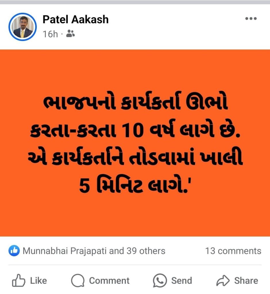 આ પોસ્ટ બાદ ભાજપના યુવા મોરચાના શહેર કારોબારી સભ્ય આકાશ પટેલ જણાવે છે કે, ગુજરાત ભાજપનું કોંગ્રેસીકરણ થઇ રહ્યું છે. કોંગ્રેસના લોકો પહેલા ભાજપ વિરોધી વિચારધારા ધરાવતા હતા. હવે તેઓ ભાજપના થઇ ગયા છે. જે લોકો જોડાઇ રહ્યા છે, તેની પાછળ કોઇને કોઇ લાલચ સમાયેલી છે. આપણે કોંગ્રેસના ભ્રષ્ટાચારની વાતો આપણે કરી રહ્યા છીએ. કોંગ્રેસ મુક્ત ભારત કરવાની જગ્યાએ કોંગ્રેસ યુક્ત ભાજપ થઇ રહ્યું છે. મારૂ ભાજપમાં જોડાવવાનું કારણ જ વિચારધારા હતી. પરંતુ હવે તેનું કોંગ્રેસીકરણ થઇ રહ્યું છે તે દુખદ છે.