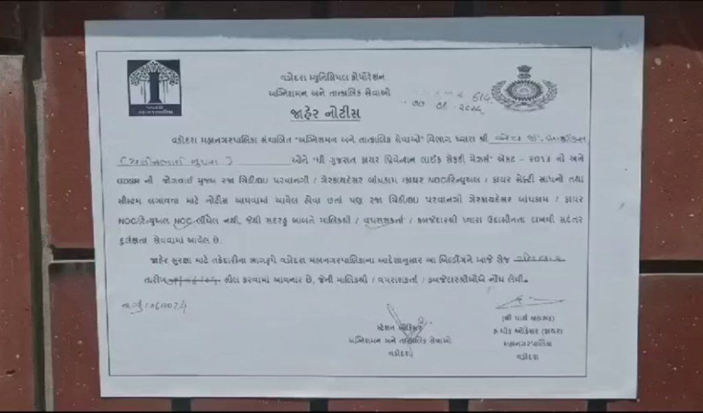 VADODARA : વડોદરાના સયાજીપુરા વિસ્તારમાં યોગ્ય મંજૂરી વગર ધમધમતી JOY E-BIKE કંપની પાલિકા દ્વારા સીલ કરી દેવામાં આવી છે. રાજકોટ ગેમઝોન દુર્ઘટના બાદ ફાયર તથા અન્ય જરૂરી મંજૂરીઓને લઇને તંત્ર દ્વારા સખ્તાઇ વર્તવામાં આવી રહી છે. જો કે, સુત્રોના જણાવ્યા અનુરા, 9, જુનના રોજ સીલ કરવામાં આવેલી કંપનીમાં આજે માણસોની ચહલ-પહલ જોવા મળી હતી. આ અંગે મ્યુનિસિપલ કમિશનર જણાવે છે કે, ભુલથી શરૂ થયુ હોય તો બંધ કરી દે. તેમ છતાં પણ બંધ નહી કરે તો સખ્તાઇના પગલાં ભરવામાં આવશે.