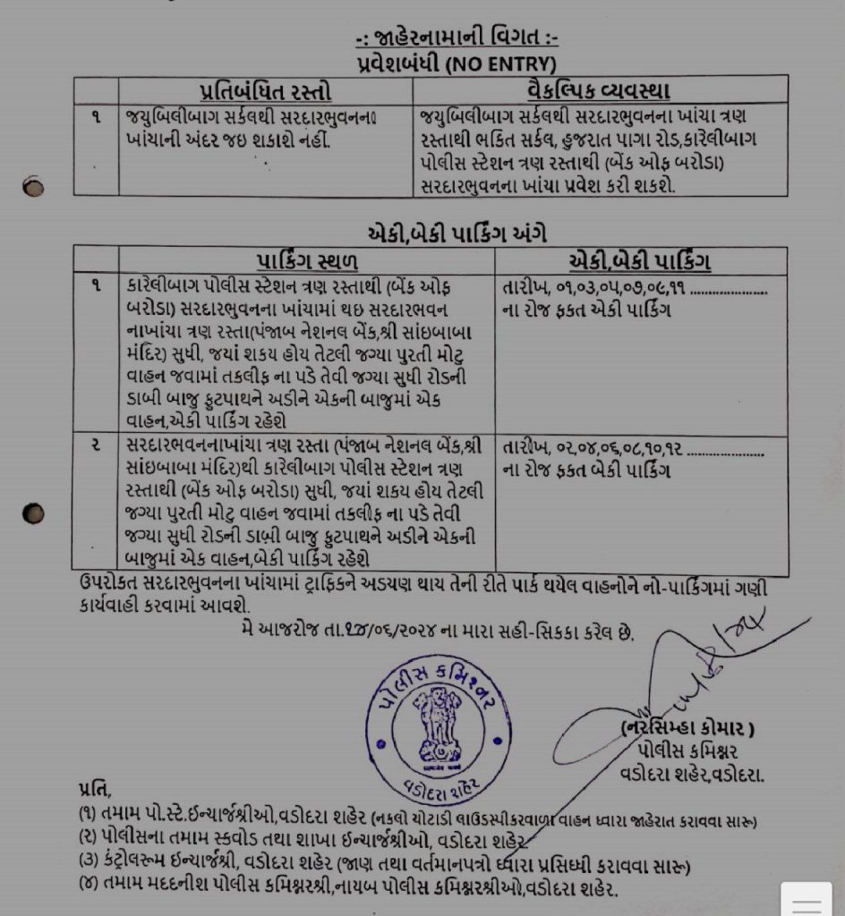 પોલીસના જાહેરનામા અનુસાર, કારેલીબાગ વિસ્તારમાં સરદાર ભુવનના ખાંચામાં મોટા પ્રમાણમાં ડ્રેસ મટીરીયલની દુકાનો આવેલી છે. જેમાં કામ કરતા તેમજ ખરીદી કરવા આવનાર તથા ત્યાં રહેનાર સ્થાનિક લોકોના વાહનો પાર્ક થતા હોય છે. સરદાર ભુવનના ખાંચાની ટ્રાફીક સમસ્યા હળવી કરવા, શહેરીજનોને અગવડતા ન પડે અને ટ્રાફીક સુચારૂ રીતે ચાલે તે હેતુથી પ્રવેશબંધી તેમજ એકી-બેકી પાર્કિંગ અંગેનું જાહેરનામું બહાર પાડવામાં આવ્યું છે. આ સાથે સદરાર ભુવનના ખાંચામાં ટ્રાફીકને અડચણરૂપ થાય તેવી રીતે પાર્ક થયેલા વાહનોને નો પાર્કિંગમાં ગણી કાર્યવાહી કરવામાં આવનાર હોવાનો જાહેરનામામાં ઉલ્લેખ છે.
