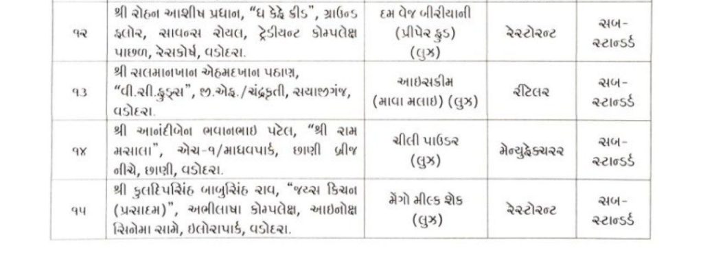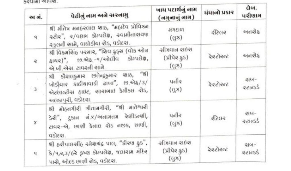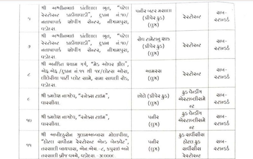 ખોરાક શાખાનાં ફૂડ સેફટી ઓફીસરો દ્વારા વડોદરાનાં વિવિધ વિસ્તારોમાં આવેલ રીટેલ દુકાનો, રેસ્ટોરન્ટ, ફુડ વેન્ડીંગ એસ્ટાબ્લીસમેન્ટ, ફુડ સર્વીસીસ હોટલ ફુડ સર્વીસીસ રેસ્ટોરન્ટ, ઉત્પાદકમાંથી મગદાળ, પનીર, સીઝવાન રાઇસ, આઇસક્રીમ, પનીર બટર મસાલા, ચીલી પાવડર, સેવ ટામેટાનું શાક, આમરસ, છોલે, દમ વેજ બીરીયાની, મેંગો મીલ્ક શેક વિગેરેનાં 15 નમુના ફુડ એનાલીસ્ટ, પબ્લીક હેલ્થ લેબોરેટરી, ફતેગંજ ખાતેના પૃથ્થકરણ રીપોર્ટ આધારે અયોગ્ય જાહેર થયેલા છે. જે પૈકી બે નમુના અનસેફ અને 13 નમુનાઓ સબ-સ્ટાન્ડર્ડ મળી આવ્યા છે. જે વેપારીઓની સામે ફુડ સેફટી એન્ડ સ્ટાન્ડર્ડ એકટ અન્વયે આગળની કાયદેસરની કાર્યવાહી કરવામાં આવશે.