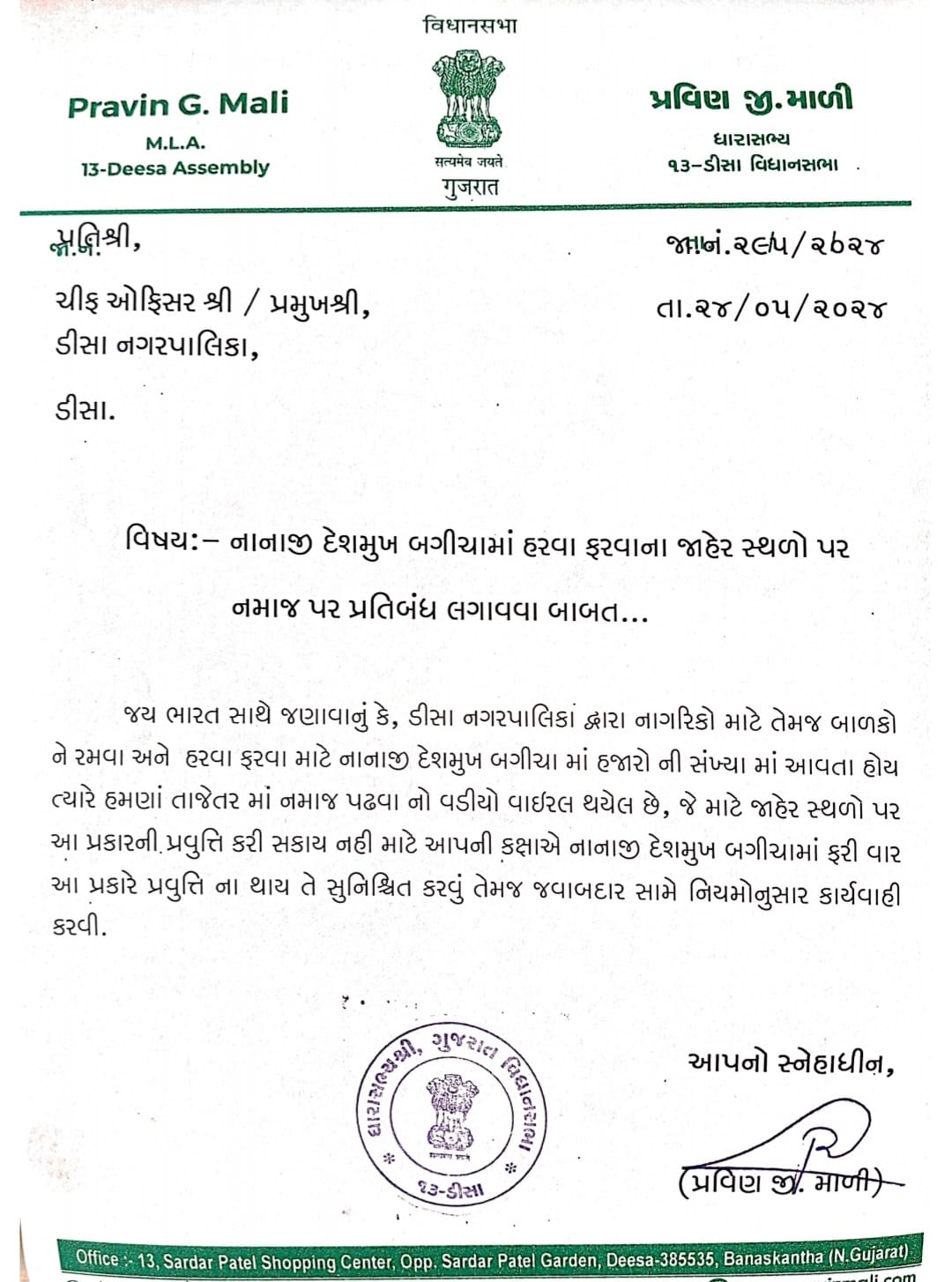 deesa  નાનાજી દેશમુખ ગાર્ડનમાં નમાઝ પઢતો વીડિયો વાયરલ  mla પ્રવિણ માળીએ લખ્યો પત્ર