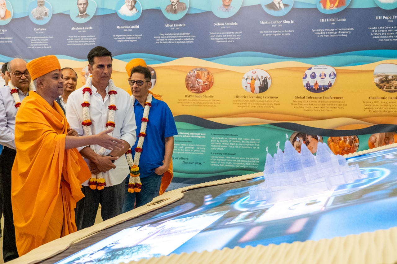 અક્ષય કુમાર અને બ્રહ્મવિહારી સ્વામી બંનેએ સંયુક્ત આરબ અમીરાતના પ્રમુખ HH શેખ મોહમ્મદ બિન ઝાયેદ અલ નાહયાનની ઉદારતા અને વિઝન અને આ આધ્યાત્મિક સ્થળના નિર્માણ માટે ભારતના વડા પ્રધાન નરેન્દ્ર મોદીના સતત સમર્થન માટે આભાર વ્યક્ત કર્યો..મંદિરના કાર્યથી મોહિત થઈને અક્ષય કુમાર અને પ્રતિનિધિમંડળ મંદિરની ભવ્ય સીડી પર ચઢ્યા હતા. તેમજ ટોચ પર પહોંચતા જ મંદિરનો આકર્ષક નજારો નિહાળ્યો હતો.