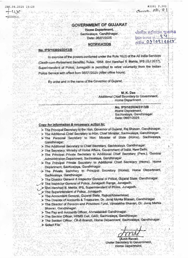 - IPS અધિકારી હર્ષદ મહેતાનું સ્વૈચ્છીક રાજીનામુ સ્વીકારાયું