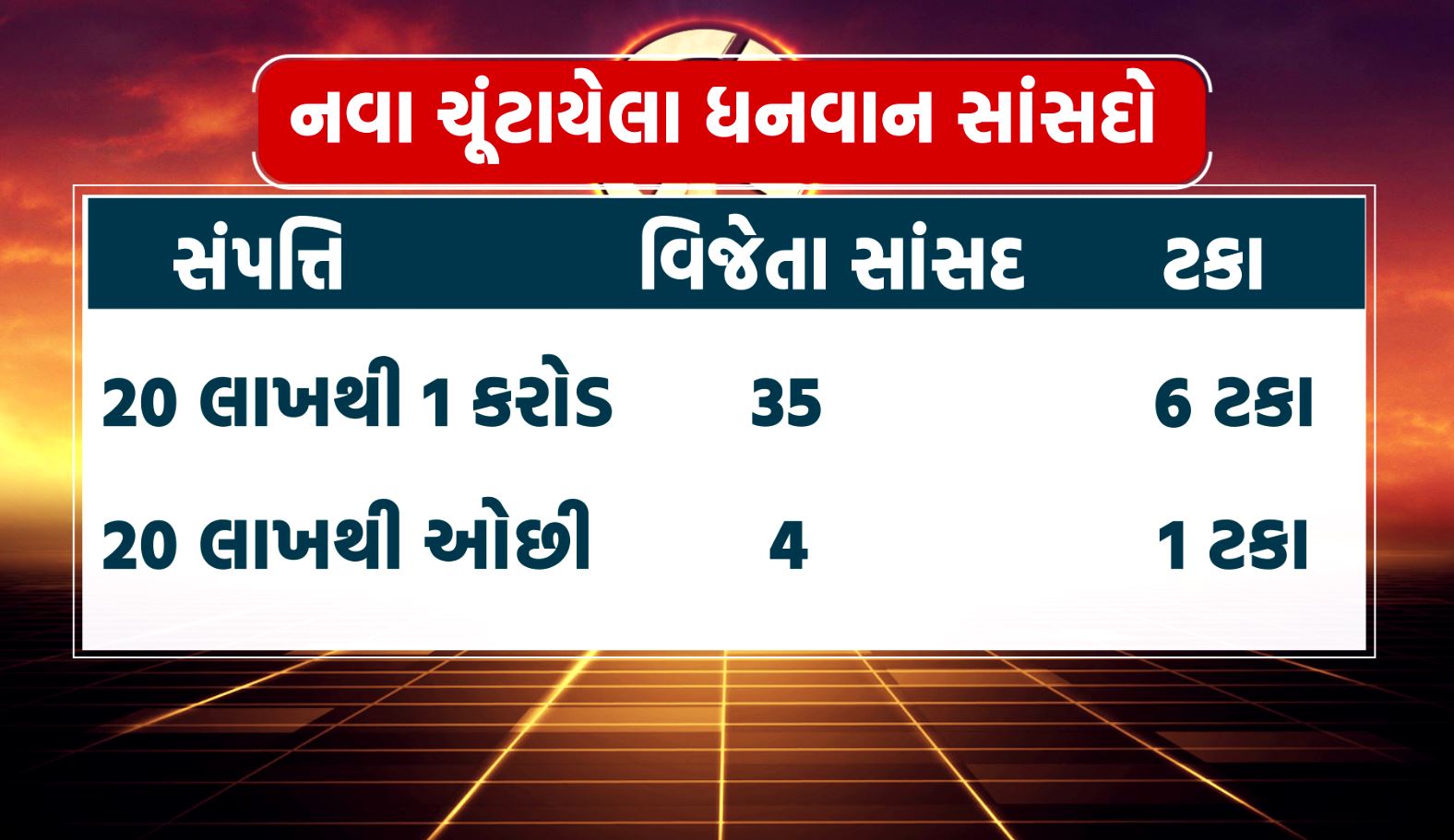 બીજી તરફ રિપોર્ટમાં જણાવાયું છે કે 543 પૈકી 504 સાંસદ કરોડપતિ છે જેમાં ભાજપના 227 અને કોંગ્રેસના 92 સાંસદ કરોડપતિ છે. DMKના 21, TMCના 27, SPના 34 સાંસદ કરોડપતિ છે. સાથે AAPના 3, JDUના 13, TDPના 16 સાંસદ કરોડપતિ છે. સૌથી વધુ TDPના ડૉ.ચંદ્રશેખર પાસે 5705 કરોડ સંપત્તિ છે અને ભાજપના વિશ્વેશર રેડ્ડી પાસે 4568 કરોડની સંપત્તિ છે તો ભાજપના નવીન જિંદલ પાસે 1241 કરોડની સંપત્તિ છે. સૌથી ઓછી ભાજપના જ્યોતિ મહતોની 5 લાખ સંપત્તિ છે.