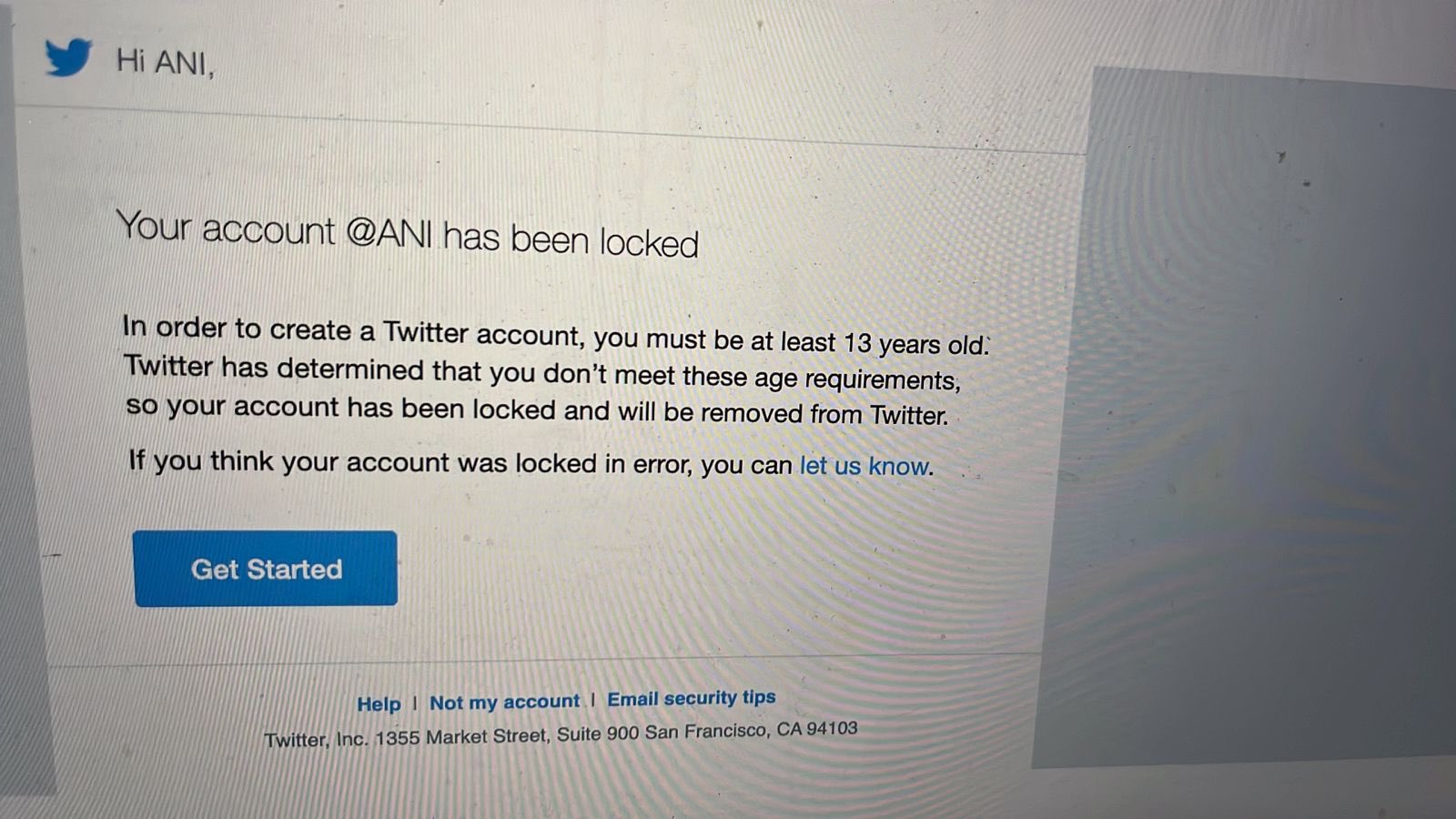 ANI ને મોકલવામાં આવેલા મેઈલમાં ટ્વીટર તરફથી કહેવામાં આવ્યું છે કે, 13 વર્ષથી ઓછી ઉંમરના લોકોને એકાઉન્ટ બનાવવાની મંજુરી નથી. મેઈલમાં લખવામાં આવ્યું છે કે, તમારું એકાઉન્ટ લોક કરી દેવામાં આવ્યું છે અને તેને દુર પણ કરી દેવામાં આવશે.