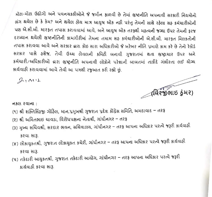 દરમિયાન કોંગ્રેસ નેતા વીરજી ઠુમ્મરે CM ભૂપેન્દ્રભાઈ પટેલને પત્ર લખી આયુષ ઓકના વધુ કારનામાઓની તપાસ કરવાની માગ કરી છે. તેમણે પત્રમાં લખ્યું છે કે આયુષ ઓક જ્યારે અમરેલીમાં ફરજ પર હતા ત્યારની ફાઈલો તપાસવી જરુરી છે. તેમણે તે સમયના મહેસૂલ ટેબલ સંભાળનારા અધિકારીઓ અને કર્મચારીઓની તપાસ કરવા માગ કરી હતી.