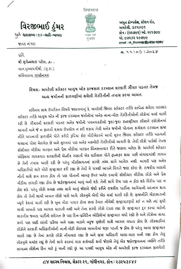 Amreli : સુરતના ડુમસની 2 હજાર કરોડની જમીનના કૌંભાડમાં સુરતના તત્કાલિન કલેક્ટર આયુષ ઓકને સસ્પેન્ડ કરાયા બાદ હવે તેમના કારનામાઓ અંગે સવાલો ઉઠાવામાં આવી રહ્યા છે. કોંગ્રેસ નેતા વીરજી ઠુમ્મરે મુખ્યમંત્રી ભૂપેન્દ્ર પટેલને પત્ર લખીને આયુષ ઓક જ્યારે અમરેલી (Amreli) માં હતા તે સમયની ફાઇલોની તપાસ કરાવાની માગ કરી છે. તેમણે પત્ર લખીને આરોપ લગાવ્યો છે કે સરકારી પડતર જમીન ઉદ્યોગોને ફાળવી દેવાઇ છે તેની ઉંડી તપાસ થવી જોઇએ.
