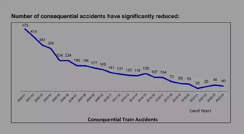 રેલ્વે દાવો કરે છે કે તેની પાછળનું કારણ રેલ્વેનું કાર્યક્ષમ સંચાલન છે અને આવા ઘણા પગલા લેવામાં આવ્યા છે જેના કારણે આવા અકસ્માતો ઓછા થયા છે. રેલ્વે દાવો કરે છે કે માનવ નિષ્ફળતાને કારણે થતા અકસ્માતોને દૂર કરવા માટે 45,000 કરોડ રૂપિયાનો ખર્ચ કરવામાં આવ્યો છે. ઑક્ટોબર 2023 સુધીમાં 6498 સ્ટેશનો પર પૉઇન્ટ અને સિગ્નલની કેન્દ્રિય કામગીરી સાથે ઇલેક્ટ્રિકલ/ઇલેક્ટ્રોનિક ઇન્ટરલોકિંગ સિસ્ટમ્સ પ્રદાન કરવામાં આવી છે. આ સાથે, LC ગેટ પર સુરક્ષા વધારવા માટે 31.10.2023 સુધી 11,137 લેવલ ક્રોસિંગ ગેટ પર લેવલ ક્રોસિંગ (LC) ગેટનું ઇન્ટરલોકિંગ પૂરું પાડવામાં આવ્યું છે.