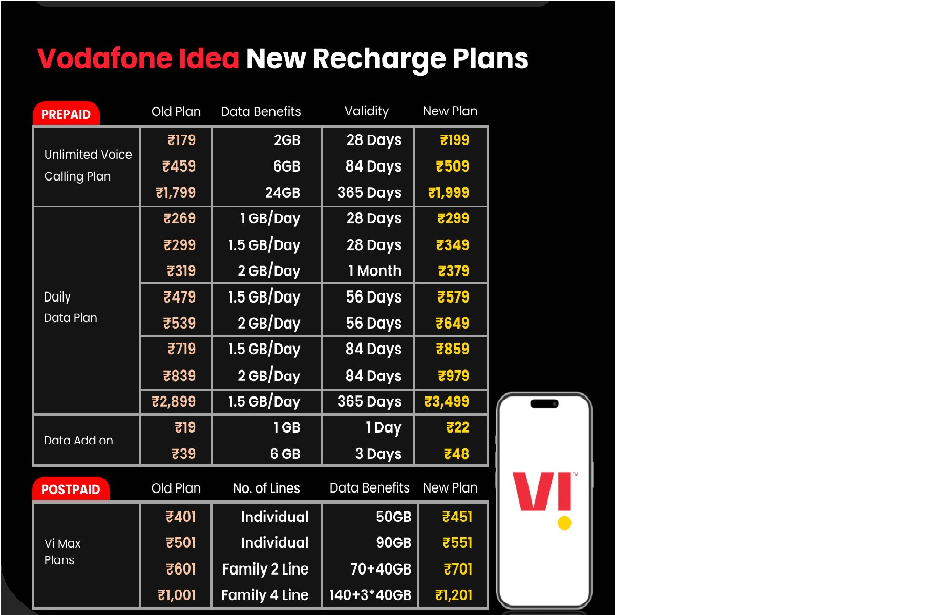 Vodafone-Idea : Airtel અને Jio બાદ Vodafone-Idea (Vi)એ પણ આજથી પોતાના મોબાઈલ પ્લાન મોંઘા કરી દીધા છે. Airtelઅને Jioની જેમ, વોડાફોન-આઈડિયાએ પણ તેના ઘણા પ્રીપેડ અને પોસ્ટપેડ પ્લાનના દરોમાં 11 થી 24 ટકાનો વધારો કર્યો છે. કંપનીએ તેના દૈનિક ડેટા પ્લાન તેમજ વેલ્યુ અને ડેટા એડ-ઓન પ્લાનને વધુ મોંઘા થયા છે.