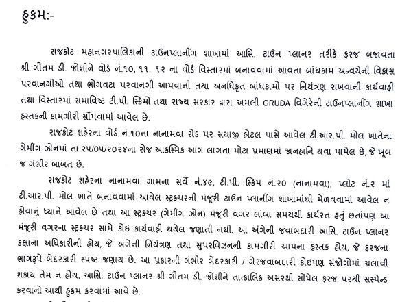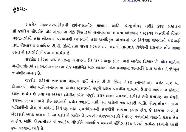 ઉલ્લેખનિય છે કે મુખ્યમંત્રી ભૂપેન્દ્ર પટેલે ગઇકાલે રાજકોટ ગેમ ઝોન દુર્ઘટના સ્થળની મુલાકાત લઇને જાત નિરિક્ષણ કર્યું હતું, તથા આ અતિગંભીર ઘટના અંગે જવાબદારો સામે કડક શિક્ષાત્મક કાર્યવાહીની સુચનાઓ આપી હતી, જેને પગલે રાજ્ય સરકારે 6 અધિકારીઓની તાત્કાલિક અસરથી ફરજ મોકુફીના આદેશો કર્યા છે.