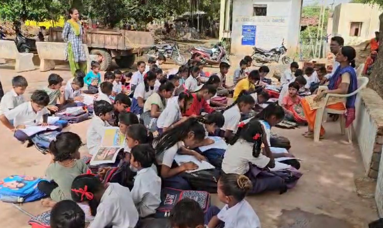 નાના ભૂલકાં શાળાની બહાર બેસીને અભ્યાસ કરી રહ્યા છે