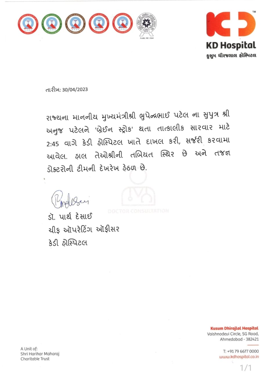 મુખ્યમંત્રી ભુપેન્દ્ર પટેલના પુત્ર અનુજ પટેલની તબિયત અંગે માહિતી આપતા કે.ડી. હોસ્પિટલ દ્વારા તેમનું હેલ્થ બુલેટિન જાહેર કરાયું છે જેમાં અનુજ પટેલની બ્રેઈન સ્ટ્રોક થતાં બપોરે 2.45 કલાકે એડમિટ કરવામાં આવ્યા હતા અને હાલ તેમની સ્થિતિ સ્થિર છે અને નિષ્ણાંત ડોક્ટરોની દેખરેખ હેઠળ તેમની સારવાર ચાલી રહી છે.