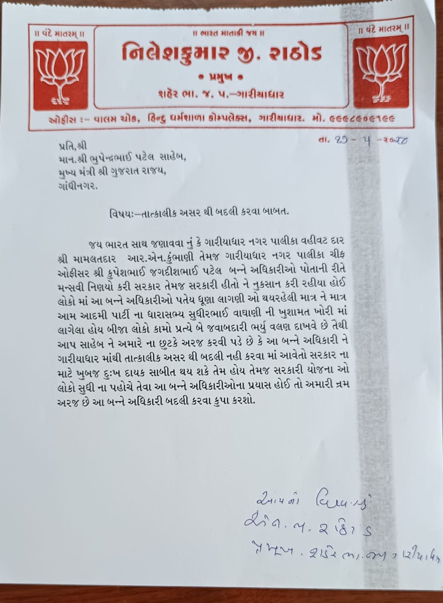 નિલેશ રાઠોડે પત્રમાં મામલતદાર, ચીફ ઓફિસરની બદલીની રજૂઆત કરી છે. ઉલ્લેખનિય છે કે AAPના સુધીર વાઘાણી ગારિયાધારથી MLA છે અને ગારીયાધાર તાલુકાની બેઠક પર આપનું શાસન છે.