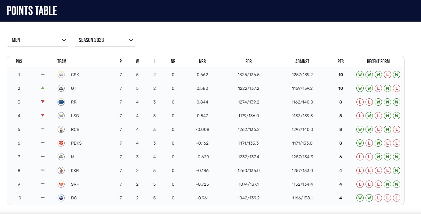 બેંગ્લોર, પંજાબ પણ પાછળ નથીIPL 2023ના પોઈન્ટ ટેબલમાં 5 અને 6માં નંબર પર બેઠેલા RCB અને પંજાબ કિંગ્સ પાસે પણ 8-8 પોઈન્ટ છે. મતલબ કે તેઓ પણ પ્રથમ 7 મેચમાંથી માત્ર 4-4 જીતી શક્યા છે. પરંતુ, તે બંન્ને ટીમો તેમની ખરાબ રનરેટના કારણે ટોપ 4માં સ્થાન મેળવી શક્યા નથી.પોઈન્ટ ટેબલ પર મુંબઈની ખરાબ રમતની અસરટૂર્નામેન્ટમાં મુંબઈ ઈન્ડિયન્સનું પ્રદર્શન નિરાશાજનક છે અને તેની અસર પોઈન્ટ ટેબલમાં જોવા મળી રહી છે. આ ટીમ 7માંથી માત્ર 3 મેચ જીતીને 7માં નંબર પર છે. આ સિવાય 8, 9 અને 10માં નંબર પર બેઠેલા કોલકાતા, હૈદરાબાદ અને દિલ્હીના 7 મેચ રમીને માત્ર 4-4 પોઈન્ટ છે. તેમની વચ્ચેનો તફાવત માત્ર રનરેટનો છે.પ્લેઓફની રેસમાં આગળ શું?હવે સવાલ એ છે કે આ 10 ટીમો પ્રથમ 7 મેચ રમીને પ્લેઓફમાં પહોંચવાની પ્રક્રિયા શું છે. મતલબ કે તેઓએ આગળ શું કરવું પડશે? તો આના માટે સારો રસ્તો એ છે કે તમામ ટીમો તેમની બાકીની 7 મેચો જીતે. પરંતુ દરેક માટે આ કરવું સરળ રહેશે નહીં.ચેન્નાઈ અને ગુજરાત અત્યારે ટોપ બે ટીમ છે. તેમના 10-10 પોઈન્ટ છે. મતલબ કે જો તેઓ આગામી 7માંથી 3 કે 4 મેચ જીતે છે, તો 16 કે 18 પોઈન્ટ સાથે તેઓ પ્લેઓફની ટિકિટ મેળવી શકે છે. આવી જ રીતે ત્રીજા નંબરથી છઠ્ઠા નંબર સુધીની ટીમોએ ઓછામાં ઓછી 4 કે 5 મેચ જીતવી પડશે. અહીં પ્રશ્ન રનરેટનો પણ હોવાથી પ્રયાસ વધુ મેચો જીતીને જીતના માર્જિનને ધ્યાનમાં રાખવાનો રહેશે.