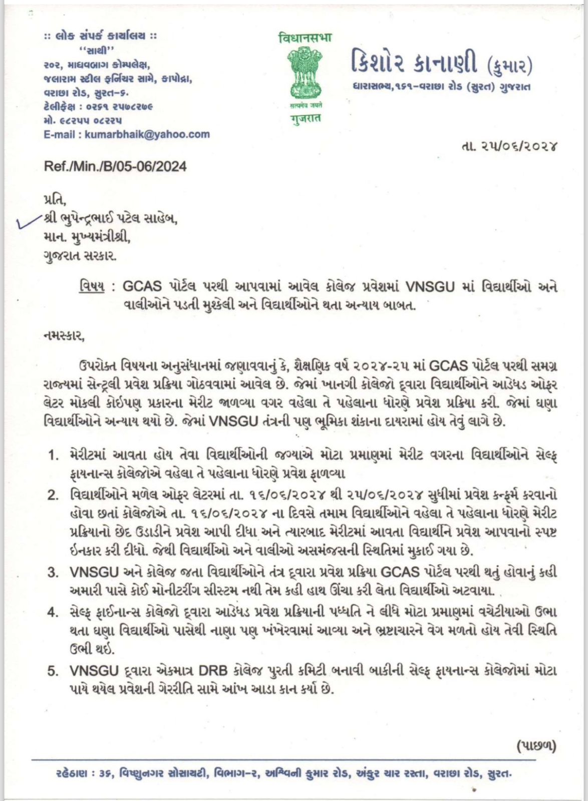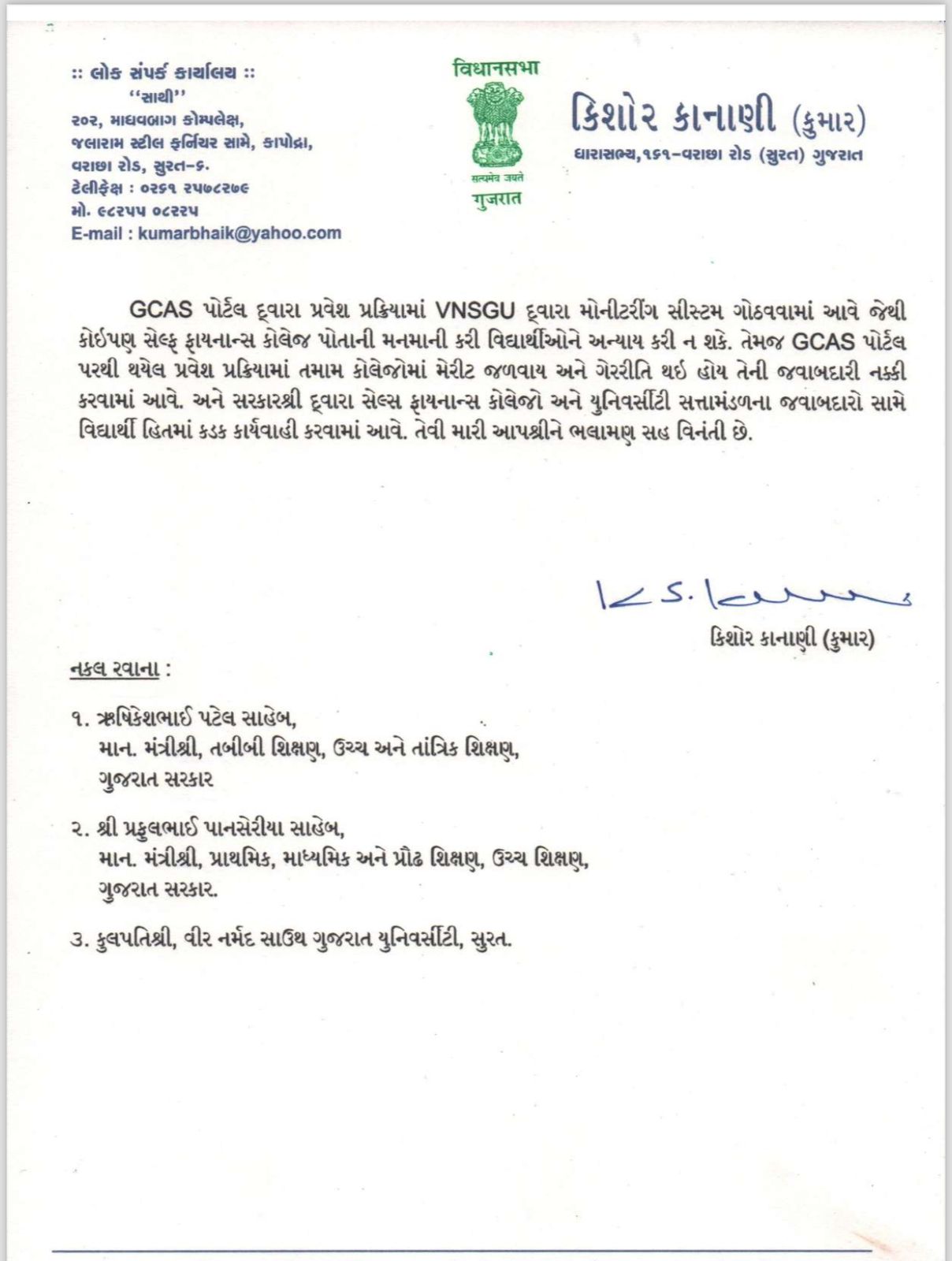 Letter : અવાર નવાર લેટર (Letter ) લખીને સરકારી તંત્રનો કાન આમળતાં સુરતના વરાછાના ધારાસભ્ય કુમાર કાનાણીએ આ વખતે સુરતની વીર નર્મદ દક્ષિણ ગુજરાત યુનિવર્સિટી પર નિશાન સાધ્યું છે. તેમણે પત્ર લખીને જીસીએએસ પોર્ટલ દ્વારા જે કોલેજોમાં પ્રવેશ ફાળવવામાં આવે છે તેની સામે સખત નારાજગી વ્યક્ત કરી છે. અને જીસીએએસ પોર્ટલ ની આખી સિસ્ટમમાં કોઈ જ મોનિટરિંગ ન હોવાથી સેલ્ફ ફાઇનાન્સ કોલેજના સંચાલકો બેફામ બન્યાનો પણ ઉલ્લેખ કર્યો છે.