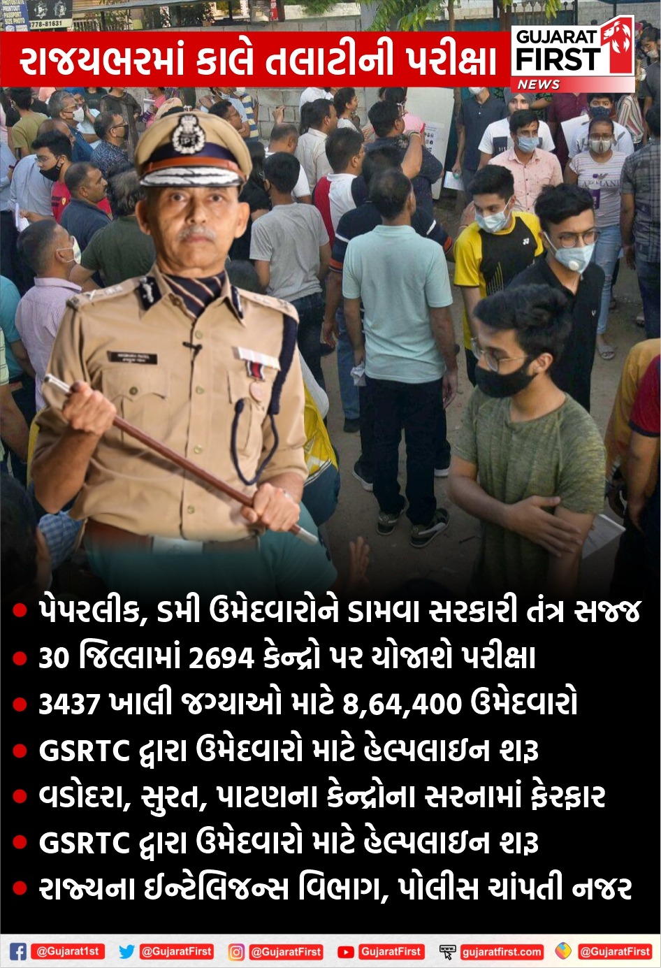 ભૂતકાળમાં પરીક્ષા સંબંધી ગેરરીતિમાં સંડોવાયેલા લોકો, કોચિંગ ક્લાસ, અસામાજિક તત્વો વિગેરે લોકો ઉપર રાજ્યનું ઈન્ટેલિજન્સ તંત્ર તથા પોલીસ ચાંપતી નજર રાખી રહેલ છે. ગેરરીતિનો પ્રયાસ કરનાર કોઈપણ વ્યક્તિ વિરોધમાં નવા કાયદા મુજબ સખતમાં સખત કાર્યવાહી કરવામાં આવશે.