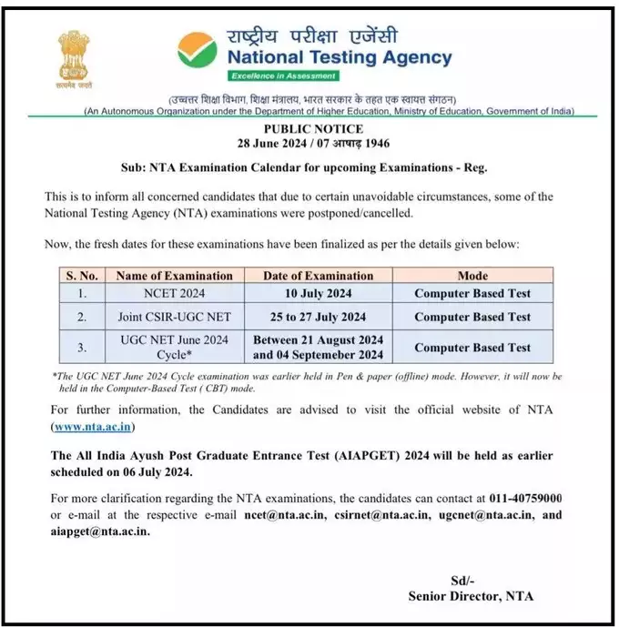 NTA એ 'આગામી પરીક્ષાઓ માટે NTA પરીક્ષા કેલેન્ડર' શીર્ષકવાળી નોટિસ બહાર પાડી, ઉમેદવારોને પરીક્ષાની નવી તારીખો અને પદ્ધતિ વિશે જાણ કરી. UGC NET જૂન 2024 ચક્ર, શરૂઆતમાં પેન અને પેપર મોડમાં હાથ ધરવામાં આવ્યું હતું, હવે તે કમ્પ્યુટર-આધારિત ટેસ્ટ (CBT) ફોર્મેટમાં બદલાશે.