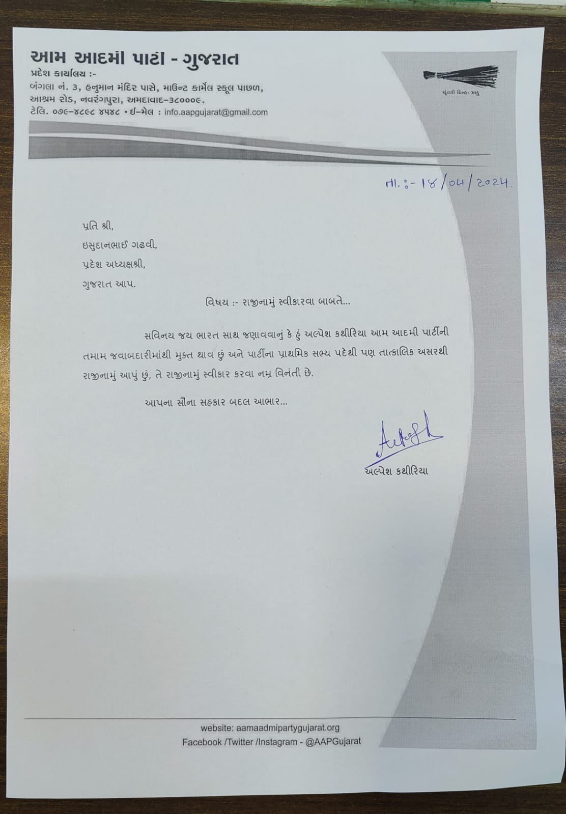 પ્રાપ્ત માહિતી મુજબ, ગુજરાત આમ આદમી પાર્ટી (Gujarat AAP) ના બે યુવા પાટીદાર નેતા અલ્પેશ કથીરિયા (Alpesh Kathiria) અને ધાર્મિક માલવિયાએ (Dharmik Malviya) AAP ને અલવિદા કર્યું છે. અલ્પેશ કથીરિયા અને ધાર્મિક માલવિયાએ ઈસુદાન ગઢવીને (Ishudan Gadhvi) રાજીનામું મોકલીને આમ આદમી પાર્ટી છોડી છે. બંને યુવા નેતાઓ પાટીદાર આંદોલનનો (PAAS) ચહેરો હતા. બંને નેતાઓના રાજીનામાથી AAP પાર્ટીને લોકસભાની ચૂંટણી પહેલા મોટો ઝટકો લાગ્યો છે.