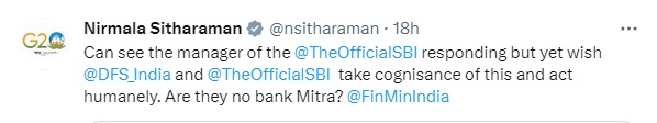 વૃદ્ધાનો વીડિયો સીતારમણે ટ્વીટર પર શેક કરી લખ્યું કે, આપણે એ જોઈ રહ્યાં છીએ કે બેંક મેનેજર આના પર જવાબ આપી રહ્યાં છે પણ ફાઈનાન્સ ડિપાર્ટમેન્ટ અને SBI આ મામલે માનવતા દાખવતા પગલાં ભરે, શું તમારી પાસે કોઈ બેંક મિત્ર નથી?